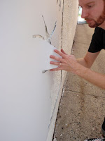 We taped the stencil edges up with duct tape. Zach rolled little loops of tape and placed them behind the floppier edges. Surprisingly, the wind made the styrene flap around a bit. We masked the area around the stencil with paper. Nothing fancy, newspaper would work.