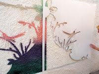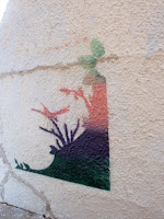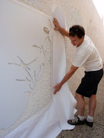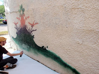 Zach and I sprayed several colors through the stencil. It was important to hold the sprayer away about 8 inches or so, to reduce over spray on the really rough stucco. When the stencil was removed, the design was pretty clear. I did not expect sharp edges.