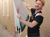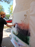 Zachary Pearl was the artist who designed this first stencil for Corcoran Neighborhood. He gracefully agreed to help do this one. It was pretty easy. We spent maybe 2 or 2 1/2 hours including clean-up. It is helpful to have a friend help you tape the stencil to your surface. It is surprisingly heavy and floppy. Once it is up and masked, it is easy to paint.